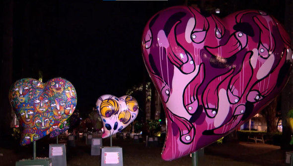 Esculturas grandes no formato de corações chamam a atenção na Praça da Liberdade