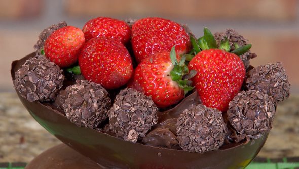 Montagem: enrole brigadeiros para enfeitar e com o restante do doce preencha todo o ovo. Decore colocando os brigadeiros na borda e os morangos no centro.